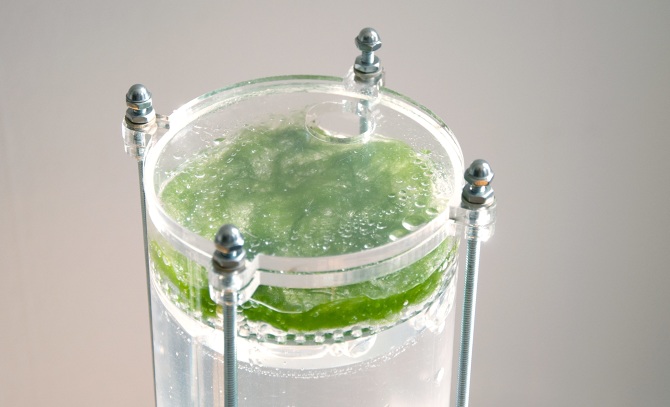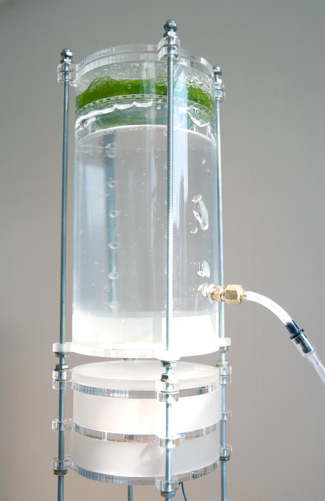 The system interprets sound levels, translating them into the illumination and activation of the bioreactor that supports the algal life.
