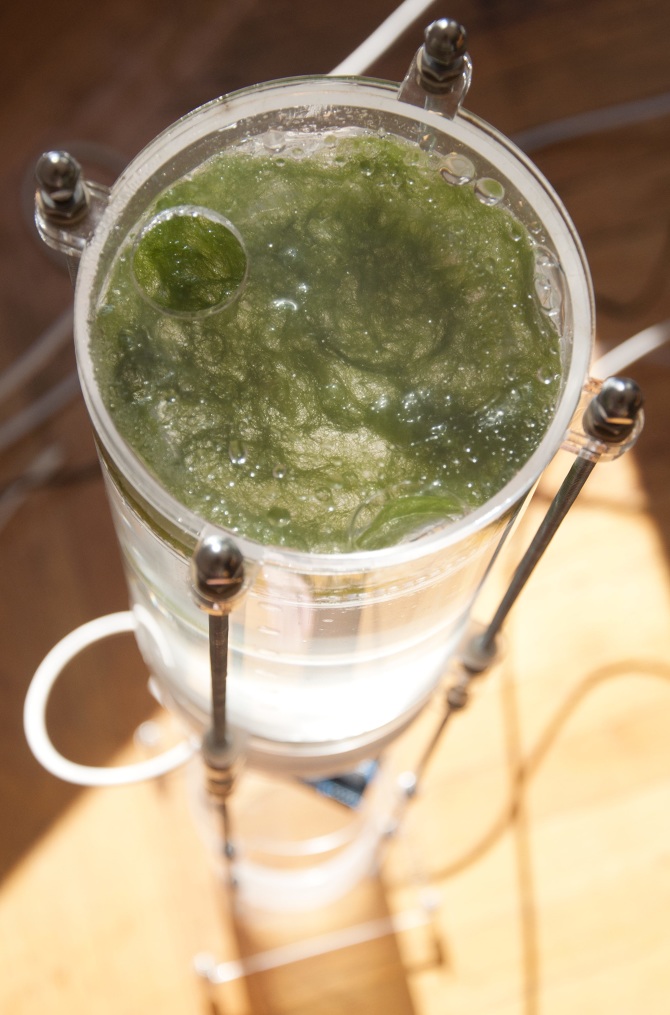 Additionally, they system parses Instagram for #climatechange, and incrementally raises the sea level in a digitized map of the world that uses the algal growth as the background for the continents. This map is projected, along with the images parsed from Instagram, onto the wall behind the bioreactor.